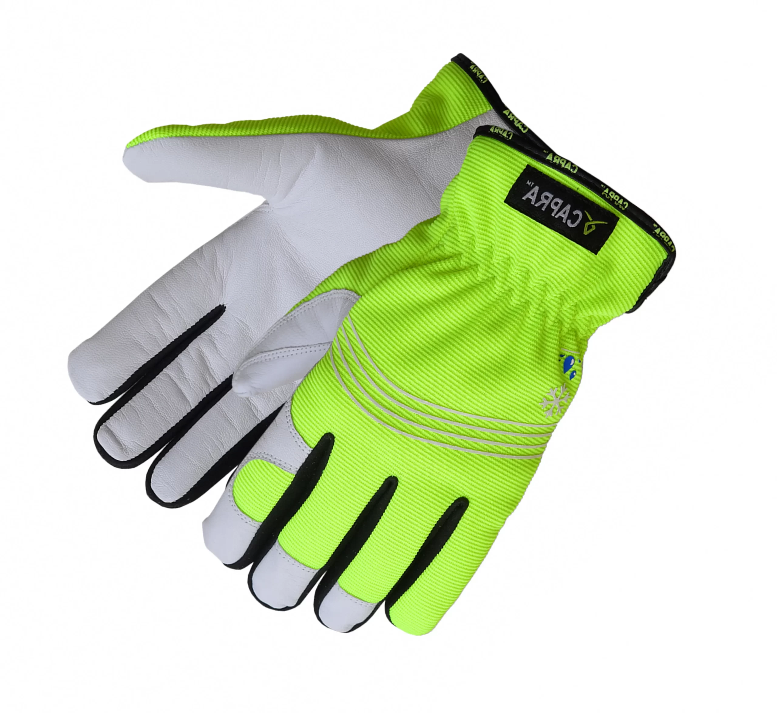 Waterproof, comfortable gloves with goat leather. The inside 40 Thinsulate aid in retaining body heat & Polyester Spandex on back. High visibility yellow on the rear provides additional safety in dim lighting.