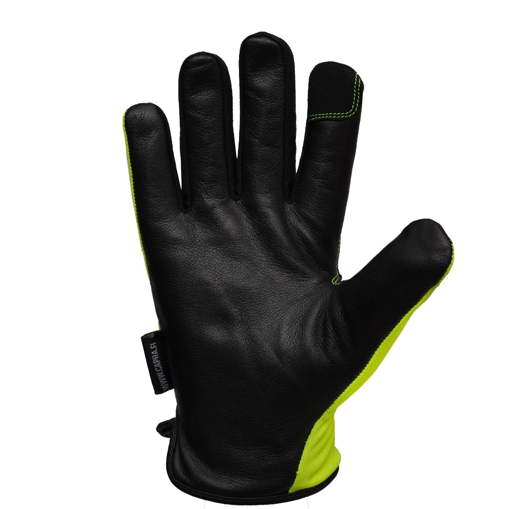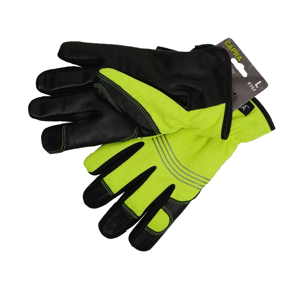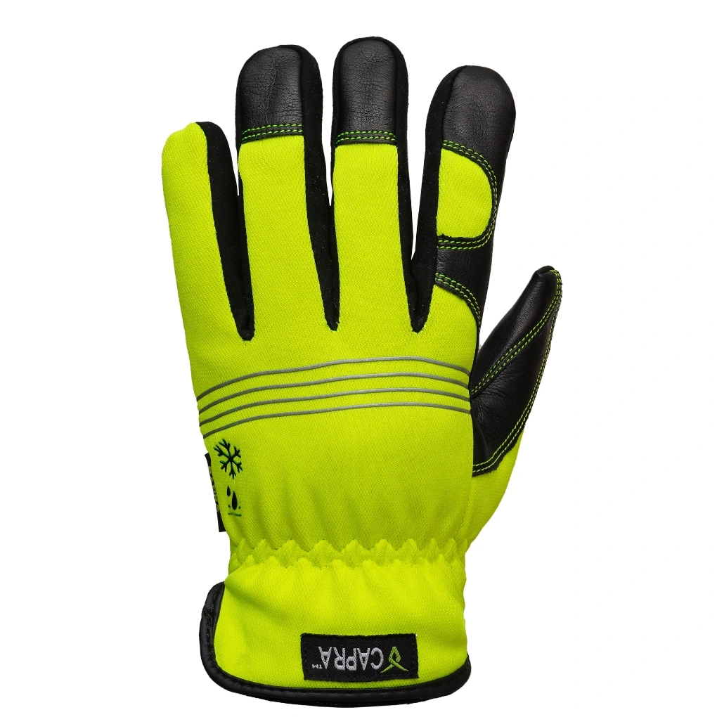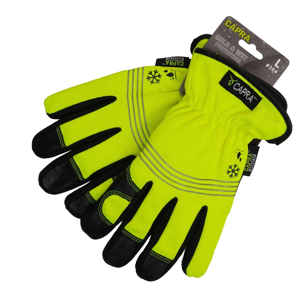 Waterproof, comfortable gloves with goat leather. The inside 40 Thinsulate aid in retaining body heat & Polyester Spandex on back. High visibility yellow on the rear provides additional safety in dim lighting.