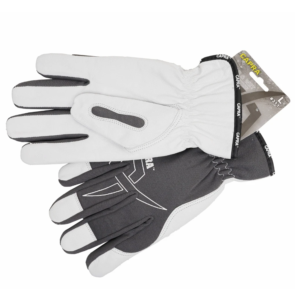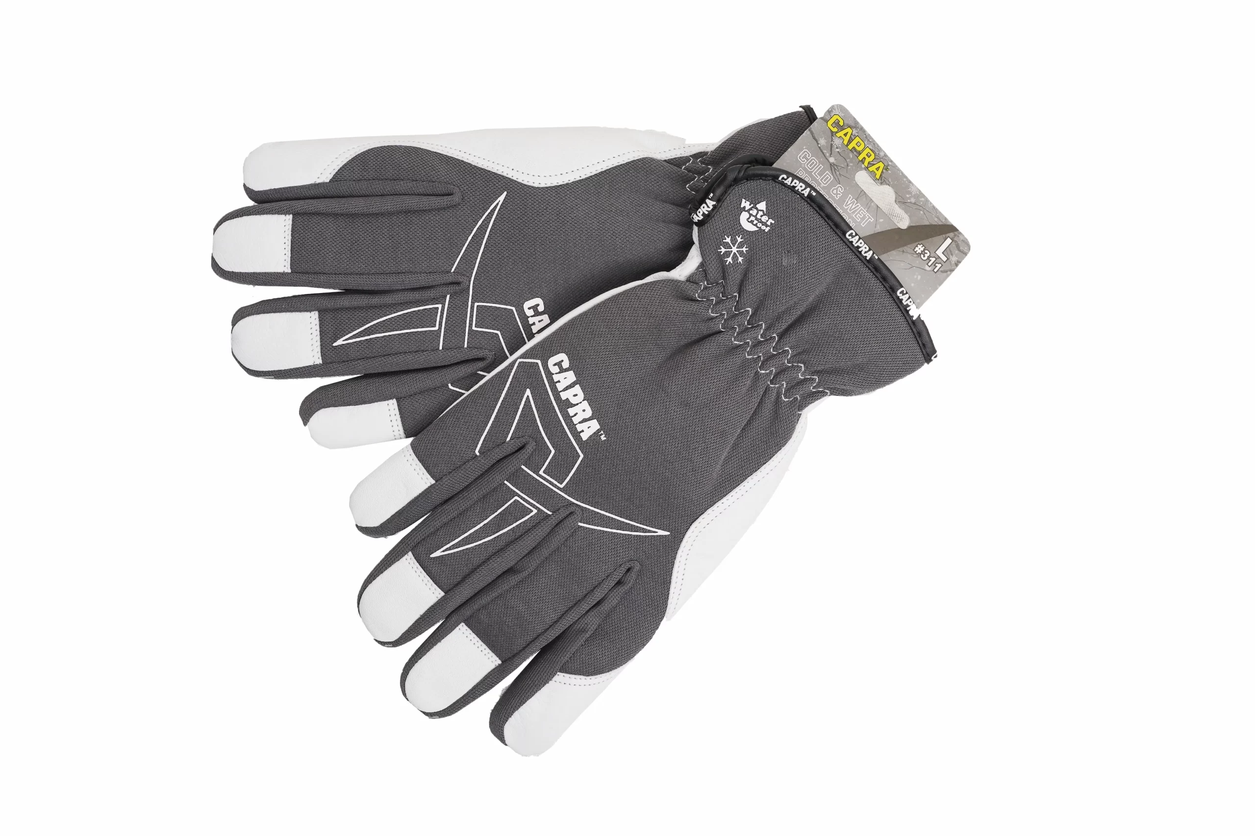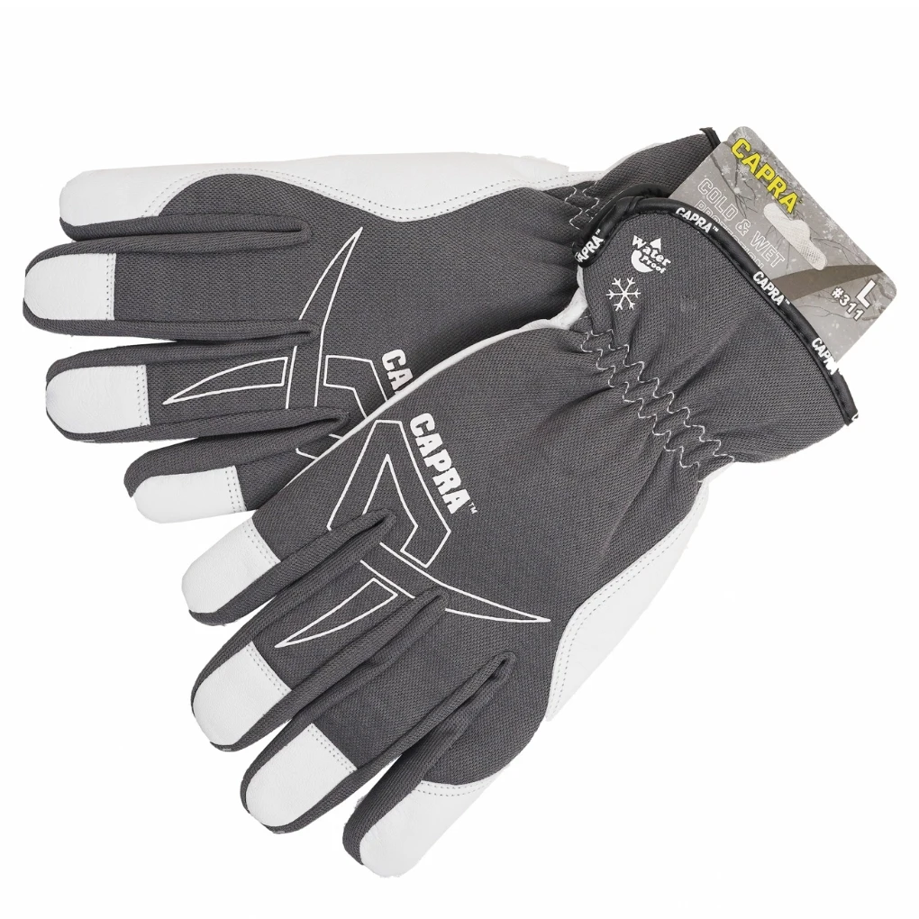 Waterproof, comfortable gloves with goat leather. The inside 40gm Thinsulate aid in retaining body heat & Bird Eye Polyester on back.