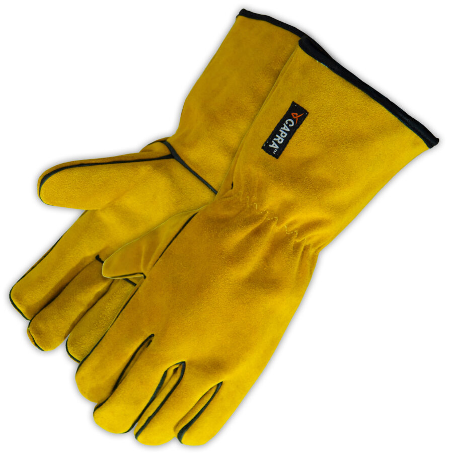 Welding glove with Split Leather. The glove withstands contact heat up to 100°C/212°F, has reinforced seams with heat-resistant sewing thread. It also withstands welding sparks and grinding splatter.